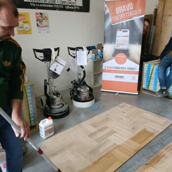 Ai parchettisti della zona abbiamo mostrato le caratteristiche dei nostri prodotti eseguendo delle prove applicative. In questo modo, hanno avuto l’occasione di testare le prestazioni del nostro adesivo silanico monocomponente Tovcol MS, della vernice Self-Linking all’acqua Uniqua SQ e del sistema colorante Belle Epoque e L’olio 100%. Grande interesse anche per la macchina levigatrice SpeedTronic, che durante le prove ha mostrato le sue eccellenti prestazioni e una maneggiabilità fuori dal comune.